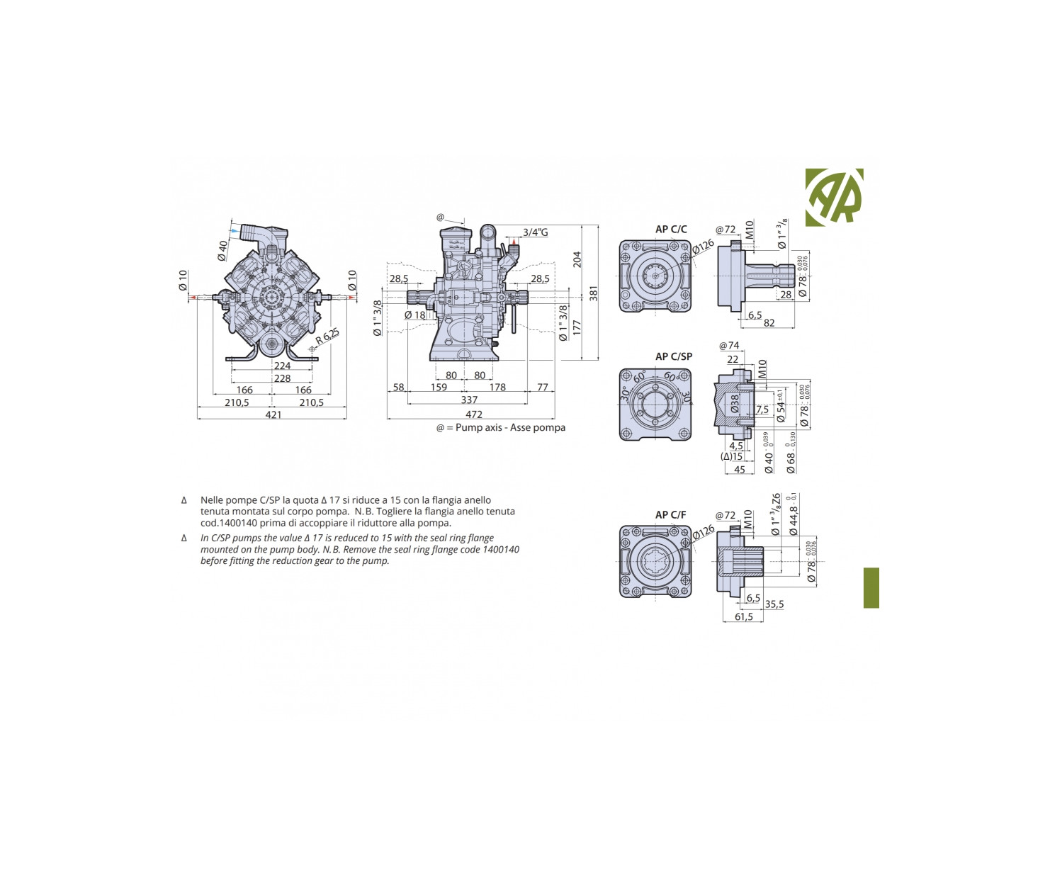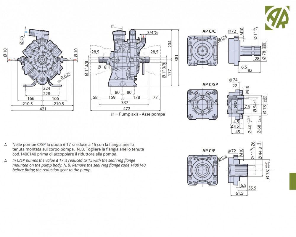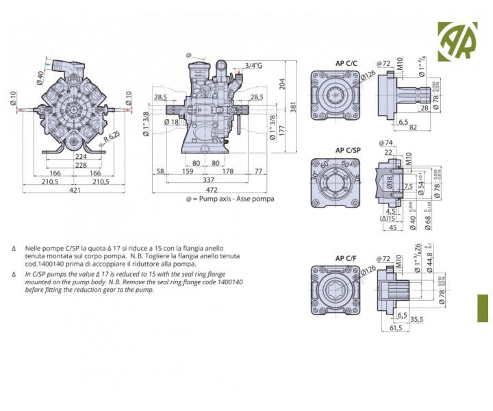 Мембранно-поршневой насос Annovi Reverberi AR 1064 обеспечивает производительность 108,5 л/мин и применяется на садовых опрыскивателях.